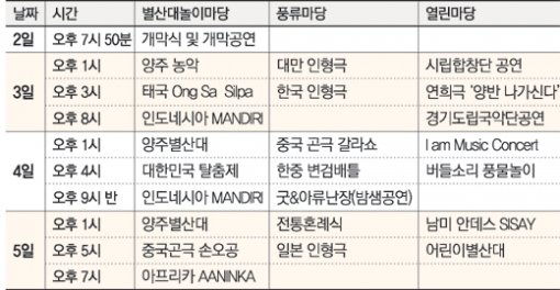 양주 소놀이굿은 중요무형문화재 70호로 서민들이 모여 가족의 번창과 풍년을 기원하는 굿 형태의 민속극이다. 또 태국의 극단 옹사실파는 혼돈의 시대를 살던 한 노숙자의 이야기를 그렸다.