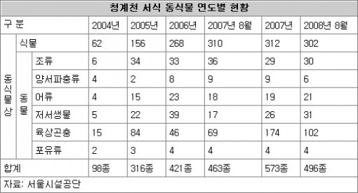 올해 8월까지 청계천에서 발견된 동식물 총 496종. 지난해 같은 기간 발견된 동식물은 463종이었다.