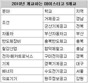 산업계가 요구하는 전문 기술인력이나 장인(匠人)을 조기 육성하기 위한 맞춤형 전문계고인 마이스터고(산업수요 맞춤형 고교)가 2010년 문을 연다.