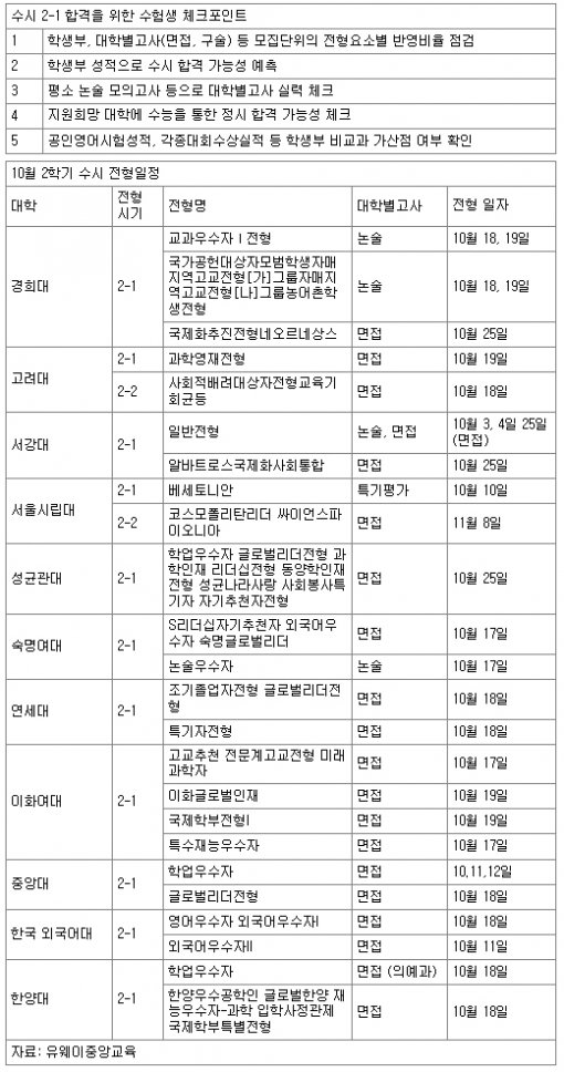 유웨이중앙교육 이만기 평가이사는 “수시 2-1에 지원한 수험생들은 학생부 성적 등으로 가늠해 본 수시합격 가능성, 모의수능을 통해 본 정시합격 가능성, 평소의 논술·면접 실력 등을 종합적으로 고려해 수능과 수시 준비를 적절히 병행하는 신중한 자세로 10월 한 달을 보내야 한다”고 말했다.
