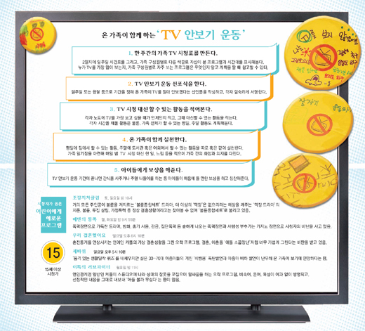 신문에 있는 TV 편성표를 일주일 간 모아뒀다가 자녀와 함께 그 주에 볼 프로그램을 정해보자. 자녀가 보고 싶은 프로그램과 부모가 추천하는 프로그램을 골고루 섞는 것이 좋다. 더 중요한 것은 부모와 자녀가 이 계획을 철저하게 지키는 것.