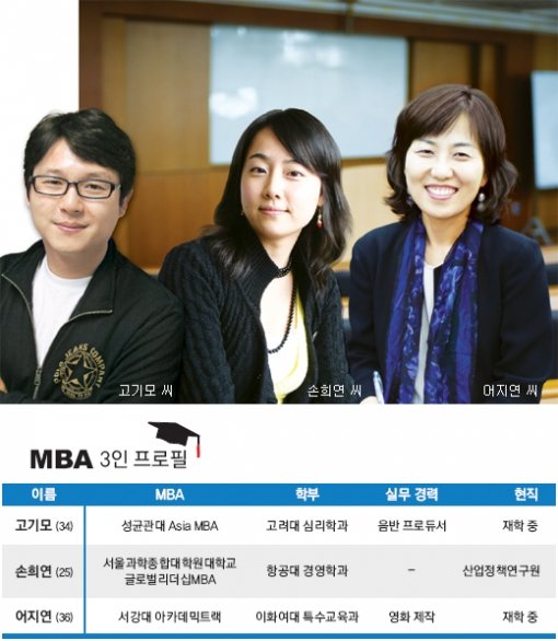 《예전에는 경영전문대학원(MBA)이라고 하면 외국 유학을 떠올렸지만 국내 대학에도 MBA가 속속 개설되면서 ‘한국형 MBA’에서 길을 찾는 이들이 늘어나고 있다. 국내 MBA 과정이 점차 다양해지고 수준도 높아지면서 자신의 경력이나 지향점에 꼭 맞는 국내 MBA를 택하는 사람들이 많아지는 것. MBA는 학문 위주의 일반 대학원과 달리 실무에 곧바로 쓸 수 있는 고강도 교육이 이뤄져 학업 강도가 ‘살인적’이다. 그런데도 MBA를 뚫은 이들의 한결같은 반응은 “정말 재미있다”는 것. 국내 MBA를 다니거나 졸업한 세 사람의 이야기를 통해 MBA의 세계를 들여다보자. 》