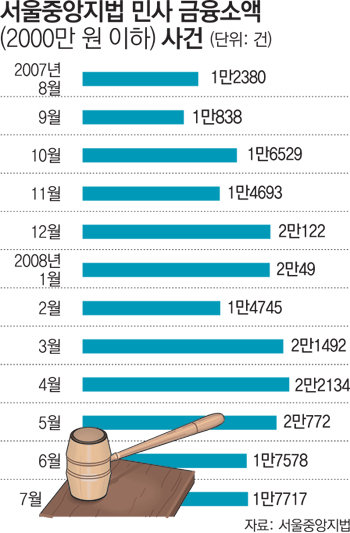 7일 서울중앙지법에 따르면 민사소액 사건은 올해 7월 한 달간 1만7717건. 지난해 12월 2만 건을 처음 넘어선 이후로 예년에 비해 2배가량 늘었다.