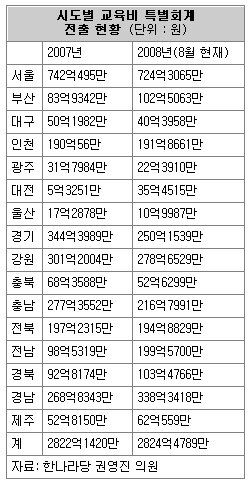 교육과학기술부가 한나라당 권영진 의원에게 제출한 시도별 교육비특별회계 전출 현황에 따르면 올해 8월 현재 각 시도가 지원한 교육비특별회계는 총 2824억4789만 원으로 집계됐다. 2007년 한 해 동안의 지원액(2822억1420만 원)에 근접한 것으로 올해 말까지 지원액은 훨씬 늘어날 것으로 전망된다.
