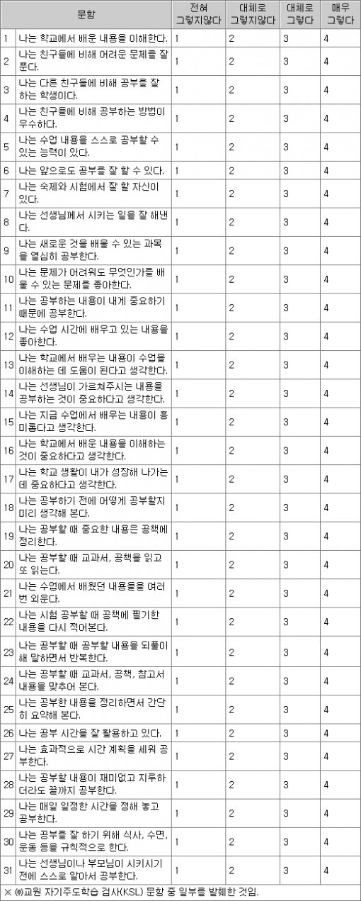 1∼8번은 자신감, 9∼17번은 학습목표, 18∼25번은 학습방법, 26∼31번은 시간조절 능력을 가늠하는 문항이다. 각 영역의 평균 점수가 3점이 넘으면 그 영역의 특성이 높은 편이라고 볼 수 있다.