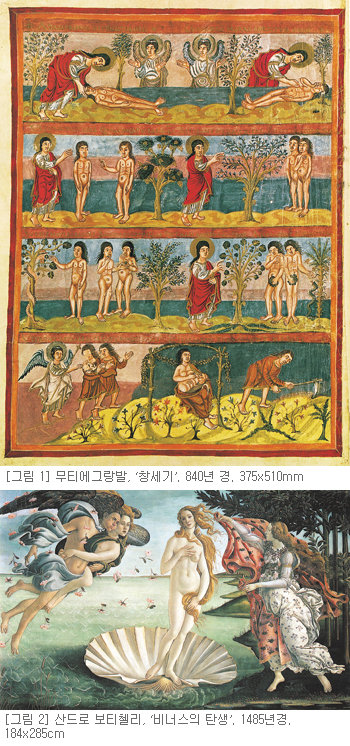 우리가 읽는 책은 대개 왼쪽이 묶여 있어서 한 장씩 넘겨가면서 읽게 되어 있지요. 그런데 이런 네모난 책, 곧 코덱스가 발명되기 전에는 기다란 두루마리를 책으로 썼다고 해요. 보통 때는 동그랗게 말아서 보관하다가 두루마리를 펼치면 글이나 그림을 볼 수 있었어요. 그러니까 아담과 이브를 그린 이 그림은 네모나기는 하지만, 실은 예전 두루마리 책의 형식을 빌려왔군요.