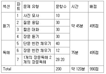 토익은 듣기(Listening Comprehension)와 독해(Reading Comprehension) 두 개의 섹션으로 구성된다. 각 섹션은 아래의 표와 같이 총 7개의 파트로 구성된다. 모든 문제는 객관식으로 출제되며 모두 네 개의 보기가 등장한다. 단 듣기 두 번째 파트에서는 세 개의 보기만 주어진다.