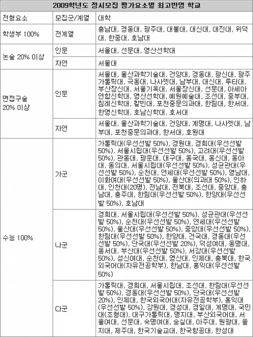 각 대학의 모집군이나 전형별 평가요소는 이미 확정된 상태지만, 평가요소별 반영비율과 방법에는 다소 변화가 있을 수도 있다. 예컨대 ‘수능 100% 전형’이라고 하더라도 세부 내용까지 똑같지는 않다. 반영하는 영역, 각 영역별 가중치, 구체적 모집방법에는 분명한 차이가 있기 때문이다. 따라서 자신이 지원할 대학의 전형안에 꾸준한 관심을 가져야 한다.