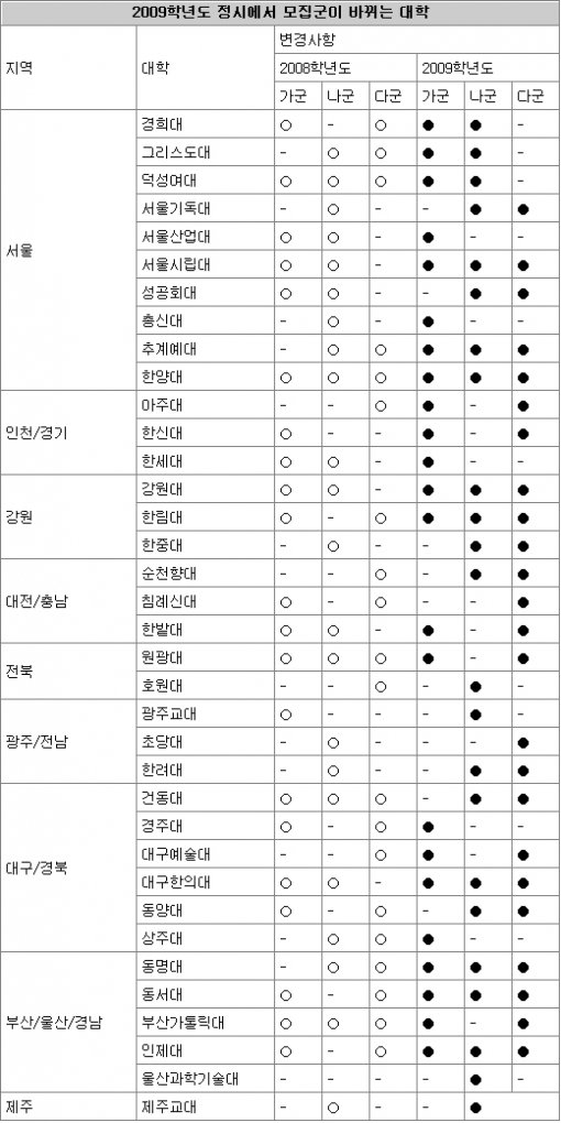 올해 입시에서는 모집군을 변경했거나 분할모집을 시행하는 학교가 상당히 많은 편이다. 이 중 눈여겨 볼 학교로는 서울시립대, 경희대, 아주대, 광주교대 등이 있다. 서울시립대는 지난해 예체능계만 ‘가’군에서 선발했을 뿐 실질적으로는 ‘나’군에 속했다. 그러나 올해는 ‘가·나·다’군에 모두 참여했다. 경희대(서울)는 ‘가·다’군이었던 모집을 ‘가·나’군으로 변경했다. 두 학교 모두 수능 우선선발 전형의 비율이 높은 편이므로 수능 성적이 좋은 학생들이 많이 지원할 것으로 전망된다. 아주대는 ‘다’군에서 ‘가·다’군으로 모집군을 확장한 경우다. 이 밖에 올해 신설된 ‘가’군 전형에는 언어·수리·외국어 영역을 점수가 좋은 순서대로 차등반영(40%→30%→20%)하는 ‘수능 70%+학생부 30%’의 전형안을 내놓았다. 광주교대는 ‘가’군에서 이탈해 ‘나’군으로 자리를 잡았다. 이로 인해 점수대와 경쟁률에는 다소 변화가 일 것이며, 광주교대 신입생 모집의 성패에 따라 추후 다른 교대의 모집군 이동도 예상할 수 있을 것이다.