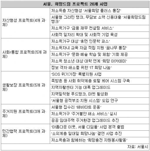 이 프로젝트는 목돈 마련, 자녀 교육, 창업 자금 등 20개 자립지원 대책을 담고 있다. 서울시는 이를 위해 기존 저소득층 지원 사업과는 별도로 2009년 382억 원, 2010년까지 총 841억 원을 투입할 계획이다.