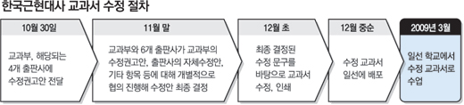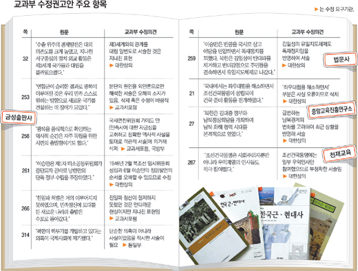 문제는 출판사들이 자체적으로 수정한 항목이 교과부가 원하는 방향과 맞지 않을 경우다. 이 경우 교과부와 출판사의 11월 협의 과정에서 충돌이 일어날 가능성을 배제할 수 없어 논란의 불씨는 여전히 남아 있는 셈이다.