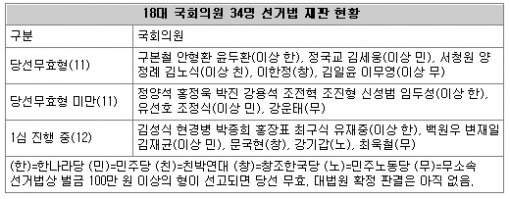 대법원 등에 따르면 선거법 위반 혐의로 기소된 18대 국회의원 34명 가운데 선고를 받은 22명의 절반(11명)이 당선무효형(벌금 100만 원 이상)을 받았다. 2심에서 형이 깎여 의원직을 유지한 사례는 아직 한 건도 나오지 않았다.