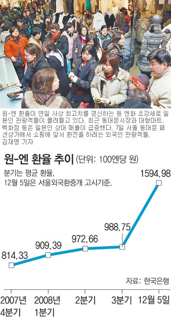 일본여행업협회(JATA)에 따르면 12월 한국을 찾은 일본인 관광객은 지난해 같은 달에 비해 68%나 늘었다. 동대문시장은 일본인 필수 관광코스다. 이들은 옷 가격이 ‘엔고’로 반값이 되자 주저 없이 지갑을 열고 있다.