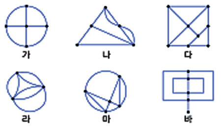 ⑵ 한 점에서 시작해 모든 선을 한 번씩만 지난 다음 출발점으로 돌아올 수 있는 도형을 찾아 쓰시오.