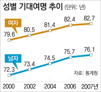 남자는 76.1년, 여자는 82.7년을 살 수 있어 여자의 기대수명이 6.6년 더 길었다. 이는 남자의 경우 경제협력개발기구(OECD) 평균과 같고, 여자는 0.9년 정도 긴 수치다.