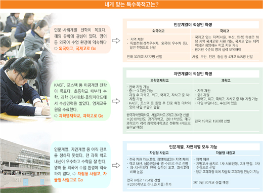 《올해 중학교 3학년이 되는 학생들은 외국어고, 과학고, 국제고, 자율형 사립고 가운데 한 학교만 지원할 수 있다. 2010학년도부터 새롭게 바뀌는 고입 제도 때문이다. 그러나 학부모와 학생들은 혼란스럽기만 하다. 이 중 어떤 학교가 적성에 맞고 대학 진학에도 유리할지 가늠하기 어려워서다. 헷갈리기 쉬운 이들 고교를 특성에 따라 분류했다.》