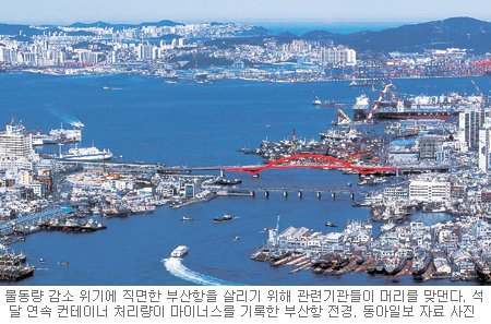 부산시와 부산해양항만청, 부산세관, 부산항만공사, 부산상의 등 19개 기관 대표가 11일 부산시청에 모여 부산항경쟁력 촉진협의회를 연다. 국제 경제위기의 여파가 부산항에도 밀어닥침에 따라 물동량을 늘리기 위한 대책을 마련하는 자리다.