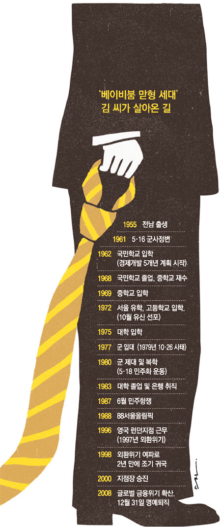 명문 사립대 정치외교학과에 ‘75학번’으로 입학한 그는 2학년을 마치고 입대한 뒤 사회가 민주화 열기에 휩싸인 1980년 대학에 복학했다. 그가 졸업장을 받은 1983년 국내 경기는 오일쇼크의 충격에서 벗어나 회복세를 탔고 경제성장률은 10.8%까지 치솟았다. 덕분에 A은행 말고도 여러 기업에 동시에 합격해 우쭐하기도 했다.