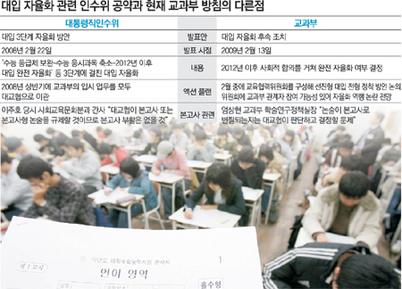 ▽혼란 있으면 자율화 없다=엄상현 교과부 학술연구정책실장은 “최근 일부 대학이 2012학년도부터 대입 완전 자율화가 추진된다는 잘못된 생각으로 2012학년도 입시안을 발표해서 혼란이 일고 있다”고 후속 조치의 배경을 밝혔다. 일부 대학이 대통령직인수위가 밝힌 자율화 시점을 2012학년도로 착각하고 있다는 것이다.
