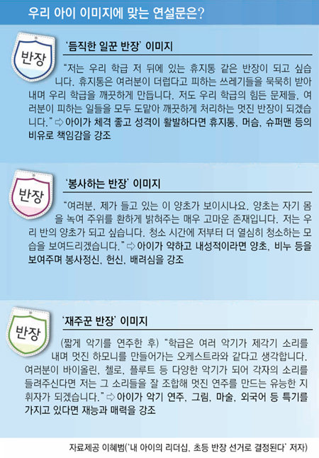 반장 선거 연설문의 핵심은 내 이미지에 맞는 연설문을 쓰는 것(그래픽 참조). 착하지만 까불거리는 성격의 장난꾸러기였던 김태현 (가명·초4)군은 태권도 허리띠를 이마에 두르고 앞에 나가 “여러분의 머슴이 되겠습니다”라고 대뜸 큰절을 해서 반장이 됐다.