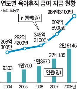 노동부에 따르면 지난해 육아휴직 급여 수급자는 2만9145명으로 2007년보다 37.5% 늘어났고, 급여 지원액도 984억3100만 원으로 61.4% 급증했다. 불황이 심해진 지난해 12월∼올해 1월의 육아휴직 급여 수급자는 5245명으로 1년 전 같은 기간(4282명)보다 22% 늘었다. 노동부는 ‘육아휴직제도가 정착되고 있다’는 내용의 보도 자료를 냈지만 현실은 그렇지만은 않다는 것을 보여준다.