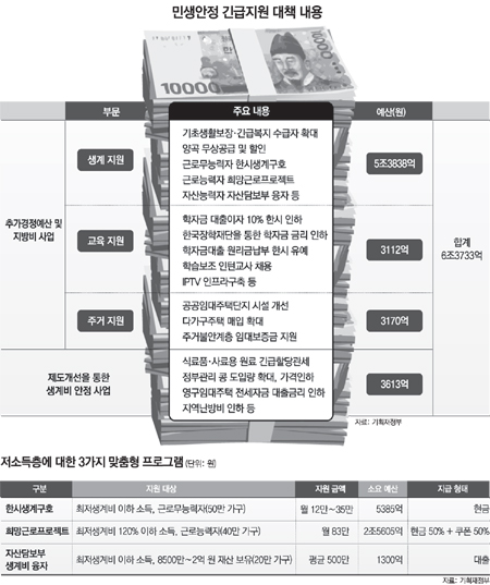 월소득이 최저생계비(4인 가구 132만6609원)에 못 미치고 근로 능력이 없는 노인, 장애인 등이 있는 50만 가구에는 생계구호 자금을 준다.