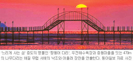 증도는 전남 무안 해제반도의 끝자락인 신안군 지도읍에서 배로 15분 거리다. 신안군의 1004개 섬 가운데 7번째 큰 섬.