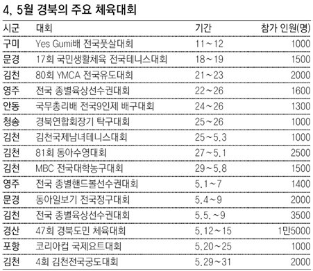 7일 경북도에 따르면 4∼5월 지역에서 열리는 도 단위 이상의 체육대회는 27개로 이 중 참가 인원이 1000명 이상인 대회는 15개로 집계됐다. 대부분 전국 규모 대회이며, 김천에서 열리는 국제테니스연맹(ITF) 남녀테니스대회와 포항 코리아컵 요트대회는 국제대회다. ▶표 참조