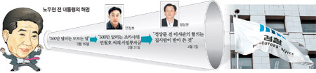 검찰은 노 전 대통령 측의 해명이 잇따라 나오자 ‘말맞추기’가 진행되는 것 아니냐는 반응을 보였다. 수사의 칼끝이 노 전 대통령 쪽으로 다가가자 처음에는 조카사위 연 씨를, 그 다음에는 정 전 비서관과 권 여사를 내세워 방어선을 구축하려 했다는 것이다. 검찰은 노 전 대통령의 혐의를 확신하는 반면 노 전 대통령 측은 방어선이 잇따라 무너지면서 봉하마을 사저 안방까지 깊숙이 후퇴한 양상이다.