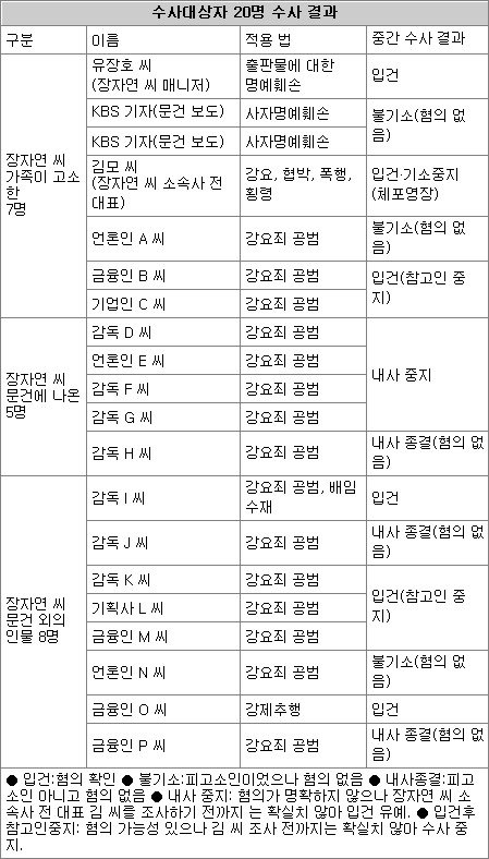 경찰에 따르면 감독 I 씨는 장 씨 캐스팅과 관련해 김 씨로부터 5000만 원을 받아 배임수재 혐의로 입건됐다. 금융인 O 씨는 술자리에서 장 씨에게 부적절한 행위를 해 강제 추행 혐의로 입건됐다. 유 씨는 장 씨 문건 끝 부분과 도장 부분을 찢어 언론에 보내 일부러 문건의 존재를 부각시키는 등 출판물에 의한 명예 훼손 혐의로 입건됐다. 일본에 도피 중인 김 씨는 강요, 협박, 폭행, 횡령 등의 혐의로 체포영장이 발부돼 기소 중지됐다.