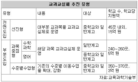▽45개 학교 전면 도입=교과부가 구상하는 2010년 교과교실제 운영 규모는 △대부분의 교과목에서 교과교실제를 도입하는 전면형 45곳 △수학 과학 또는 영어에 한해 적용하는 일부과목 중점형 240∼260곳 △수준별 이동수업을 강화하는 수준별수업 확대형 350∼370곳이다. 완전한 의미의 교과교실제는 ‘전면형’만 해당된다. 하지만 전면형은 예산과 교원이 너무 많이 투입돼야 하기 때문에 교과부는 일단 시범실시 결과를 지켜본 뒤 중장기적으로 확대할 방침이다.