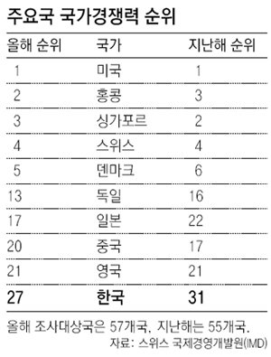 지난해 31위로 2007년(29위)보다 2계단 하락했던 한국의 국가경쟁력 순위는 올해 4계단 상승하면서 2005년의 순위(27위)를 회복했다. 국가경쟁력 4대 부문 중에서는 기업 효율성이 지난해 36위에서 올해 29위로 7계단 상승하며 전체 순위를 끌어올렸다. 정부 효율성은 37위에서 36위로 1계단 오르는 데 그쳤고 경제성과(47위→45위)와 인프라 구축(21위→20위)도 상승폭이 크지 않았다.