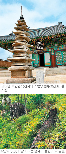 스피커를 통해 흘러나오는 불경 소리와 수학여행 온 여고생들의 재잘거리는 소리가 경내에 어우러졌다. 주위 산자락엔 소나무들이 초록빛을 뽐내고 그 사이로 울긋불긋한 꽃들이 얼굴을 내밀고 있다. 5일 찾은 강원 양양군 강현면 낙산사는 너무나 평화로운 풍경이었다.