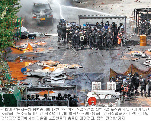 4일 대규모 경찰력이 투입된 쌍용자동차 평택공장 안팎은 전쟁터를 방불케 했다. 경찰이 뿌린 최루액이 공중에 퍼지고 노조원들이 태운 타이어에서 연기와 매캐한 냄새가 진동했다. 공장 곳곳에서 피어오르는 검은 연기는 4∼5km 떨어진 경부고속도로에서도 한눈에 보일 정도였다. 경찰과 노조원들은 이날 ‘전투’나 다름없는 일진일퇴의 공방전을 펼쳤다. 경찰은 공중과 지상에서 대규모 장비와 인력을 투입해 노조원들이 점거하고 있던 차체2공장 등 일부 시설을 확보했다.