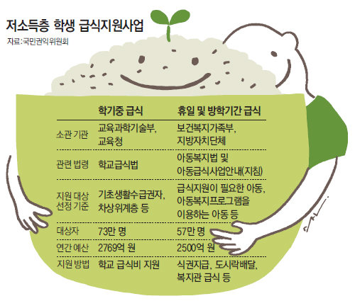 권익위 관계자는 “복지부가 아동복지법을 바꾸면 현재 방학 중 급식지원 대상에서 빠진 저소득층 학생 16만 명이 혜택을 받을 수 있다”며 “손숙미 한나라당 의원도 비슷한 내용의 아동복지법 개정안을 국회에 제출했다”고 말했다.