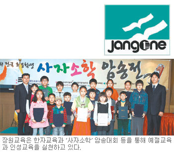 장원교육의 교육철학은 ‘뿌리’를 중시하는데서 출발한다. 한자교육과 더불어 전통문화를 계승하기 위해 다양한 노력을 기울이는 것도 이런 맥락. 아이들의 인성교육을 위해 2007년 ‘예절인성교육 캠페인’을 시작하는 한편, (사)한국생활한자문화회가 주최하고 교육과학기술부와 전국 13개 교육청이 후원하는 ‘전국 초등학생 사자소학 암송전’을 장원교육이 주관하는 것도 같은 이유에서다. ‘사자소학'은 부모에 대한 효도, 형제간 우애, 친구간 우정, 스승 섬기기, 바람직한 대인관계 등을 갖추기 위한 행동철학이 담겨져 있다.