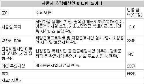 시는 이번 추경예산 중 1210억 원을 서민 가정 및 여성, 아동, 노인, 장애인을 위한 복지 사업에 투자하기로 했다. 이에 따라 수입이 없어 위기에 처한 가정에 생계비가 지원되는 한편 서울 전역 골목길엔 여성의 안전한 귀갓길을 위해 폐쇄회로(CC)TV 935대와 보안용 가로등 9032대가 설치된다. 또 저소득층에 일자리를 제공하는 ‘희망근로프로젝트’에 1395억 원, 영세소상공인 자금 및 보증지원 확대에 864억 원 등 2349억 원이 투입된다.