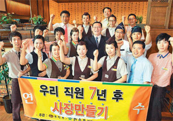 황 사장이 말하는 ‘우7사’는 ‘우리 직원 7년 후 사장 만들기’ 프로그램의 약자. 요식업 경력 20년인 그는 “서구식 패스트푸드의 대안으로 한식을 내세우기에 앞서 우리 스스로 경쟁력을 돌아봐야 한다”며 “당장 요식업 종사자들이 희망을 갖고 평생 직업으로 삼을 수 있도록 희망을 불어넣자는 것이 ‘우7사’를 창안한 배경”이라고 설명했다.