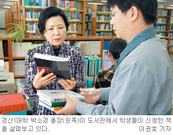 이 대출 시스템으로 구입하는 책은 월평균 100여 권. 책읽기와 글쓰기를 즐기는 이 대학 박소경 총장(58·여)은 틈틈이 도서관에 들러 학생들이 어떤 책을 신청하는지 살펴본다. 박 총장은 “이 시스템을 이용해 책을 신청하는 것을 보면 학생들이 어디에 관심이 많은지 알 수 있다”며 “도서관 행정을 바꾸니 책을 가까이 하는 학생이 늘어나는 점도 중요하다”고 밝혔다. 20일부터 22일까지 열리는 이 대학 가을축제의 주제가 ‘책’인 것도 이런 분위기 덕분이다.