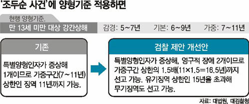 그러나 양형위 내부에서는 검찰 측 제안에 부정적 기류도 적지 않은 것으로 전해졌다. 조두순 사건의 경우 현행 양형안도 특별양형인자에 ‘소아 성 기호증’이 포함돼 있기 때문에 형량 구간을 두 차례에 걸쳐 높이는 것이 가능하다는 것. 또 특별양형인자를 세분화해 적용대상이 늘어나면 형량이 지나치게 높아진다는 얘기도 나온다.