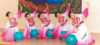 최근 광주에 사는 새터민 예술인으로 구성된 백두산민족예술단이 북한 음식 전문식당인 ‘백두산’에서 ‘물동이 춤’을 선보이고 있다. 사진 제공 아시아문화교류재단