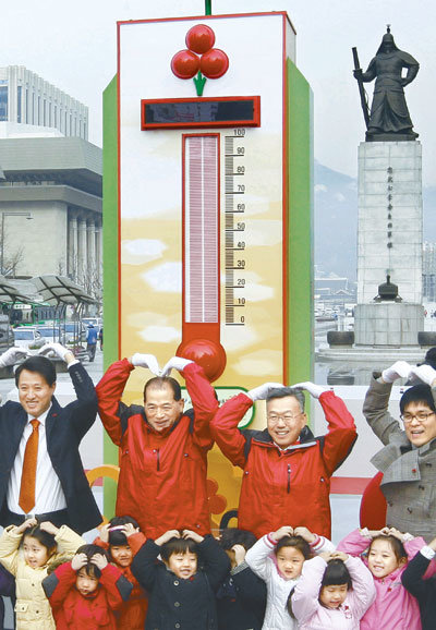 사회복지공동모금회도 이날 서울 광화문광장 이순신 동상 앞에서 ‘사랑의 행복 온도탑’ 시연식을 갖고 내년 1월 31일까지 두 달 동안 지속되는 ‘희망 2010 나눔 캠페인’에 들어갔다. 2000년 처음 설치돼 매년 12월 11일 서울시청 앞에 세워졌던 온도탑은 올해 처음으로 광화문광장으로 자리를 옮겼다. 서울 외에도 부산, 대구 등 전국 15곳에 동시에 세워지는 온도탑은 전국에서 모금된 성금액에 따라 온도계 눈금이 올라간다. 올해 모금 목표액인 2212억 원의 1%인 22억1200만 원이 모금될 때마다 1도씩 올라가 목표액에 도달하면 100도가 된다.