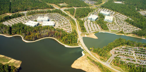 미국 노스캐롤라이나 주의 리서치트라이앵글파크(RTP)를 하늘에서 내려다본 모습. RTP는 50여 년 전 기본계획을 수립할 때부터 입주 기업의 직원들이 쾌적한 환경에서 근무할 수 있도록 오염배출 업체의 진입을 철저히 차단하고 건폐율을 15%로 제한해 충분한 녹지공간을 확보했다. 사진 제공 RTP