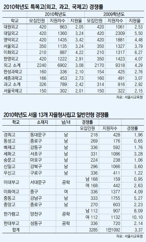 《2010학년도 서울지역 자율형사립고(자율고)와 특수목적고(외국어고, 과학고, 국제고)의 원서접수가 3일 마감됐다.