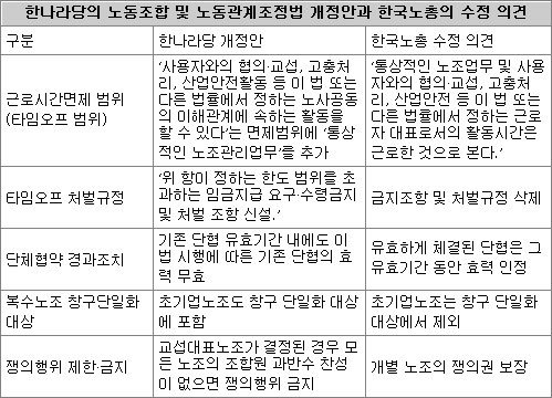 한국노동조합총연맹(한국노총)이 최근 노동조합 및 노동관계조정법 개정안을 사실상 무력화하는 수정의견을 국회에 제출한 것으로 확인되면서 노사관계가 또다시 요동치고 있다. 한국노총은 타임오프(time off·근로시간면제) 범위를 확대하고, 이를 위반했을 때 처벌하는 조항을 삭제하는 것을 골자로 하는 수정의견을 11일 제출했다. 앞서 한나라당은 8일 전임자 임금지급 금지와 관련해 타임오프의 범위에 노사정 합의에다 ‘통상적 노조관리업무’를 추가한 법 개정안을 국회에 제출했다. ○ 불씨가 된 한국노총의 수정의견