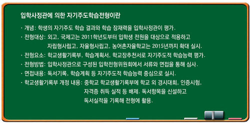 《교육과학기술부가 지난해 12월 10일 ‘고교 선진화를 위한 입학제도 및 체제 개편 방안’을 발표한 이후 ‘입학사정관제’가 입시의 핫이슈로 떠올랐다. 일부 대학과 특목고에서 부분적으로 시행했던 선발방식인 입학사정관제를 올해 고교 입시부터 대폭 확대하겠다고 한 것. 학생들과 학부모는 갑작스러운 정책 변화에 당혹감을 감추지 못하고 있다. 입학사정관제가 무엇인지 알고 차근차근 준비한다면 위기를 기회로 바꿀 수 있다. 입학사정관제의 실체를 속속들이 파헤쳐보자.》