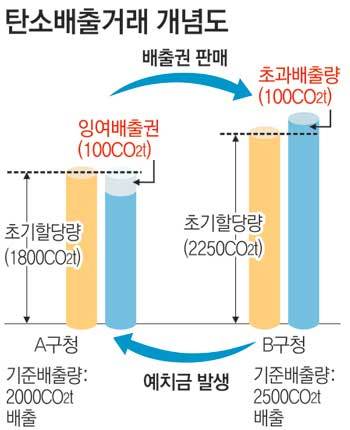 탄소배출권 거래제는 온실가스 배출 총량을 제한하는 대신 감축 목표를 초과 달성하면 그만큼을 거래할 수 있도록 한 제도다. 시는 본청을 비롯해 산하기관과 25개 자치구 공공청사 내 냉난방 에너지 사용량을 토대로 온실가스 기준배출량을 산정하기로 했다. 이를 기준으로 기관마다 10%는 의무적으로 줄여야 한다. 그 이상을 감축하면 10% 감축에 실패한 다른 기관에 판매할 수 있다. 예를 들어 기준배출량이 2000CO₂t인 기관이 감축목표인 200CO₂t보다 100CO₂t을 초과 감축하면 그만큼을 다른 참여기관에 팔 수 있다. 반면 감축목표량이 모자란 곳은 부족한 만큼 사들여 감축목표를 채워야 한다.