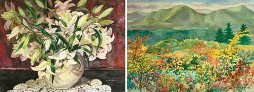 송암 문화사업 기금 조성을 위한 전시회에 출품될 송암 박두성 선생의 딸 박정희 씨 작품 ‘찬양’(왼쪽)과 손녀 유명애 씨의 작품 ‘가을’. 전시회에는 이들 모녀 작품 90점가량이 출품되며 수익금은 문화사업 기금으로 활용된다. 사진 제공 ‘송암 박두성 선생 문화사업선양회’