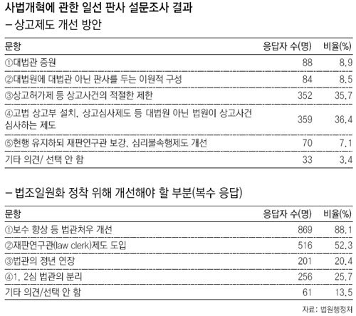 조사 결과에 따르면 응답자 986명 가운데 359명(36.4%)이 고등법원 상고부 설치나 상고심사제 등 대법원이 아닌 법원에서 일정 부분 상고사건을 처리하거나 심사하는 제도에 찬성한다고 답변했다. 352명(35.7%)은 상고허가제를 도입해 상고사건에 적절한 제한을 두는 것이 바람직하다고 답변했다. 대법관 증원에 찬성하는 의견은 88명(8.9%)에 그쳤다.