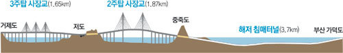 그런데 가덕도와 중죽도 사이 3.7km는 텅 빈 바다다. 부산∼거제도 연결도로(거가대교·8.2km)라는데 부산 가덕도는 빼고 거제도와 작은 섬 두 개만 연결하기 위해 공사비 1조7000억 원을 들여 6년째 다리를 놓고 있는 것일까.